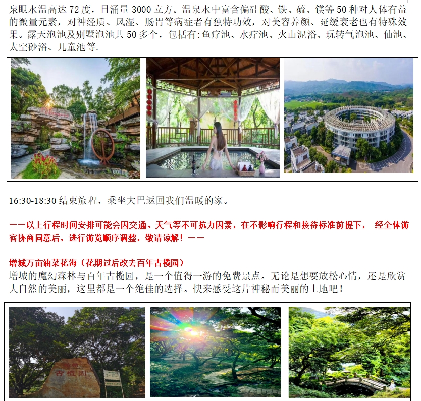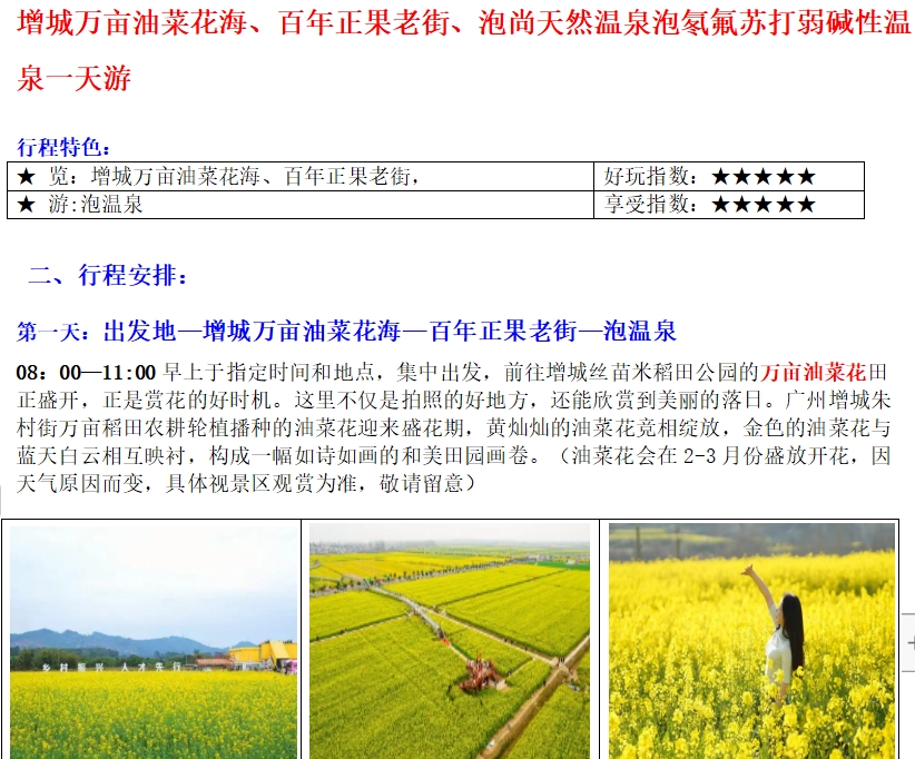 第一天:出发地—增城万亩油菜花海—百年正果老街—泡温泉