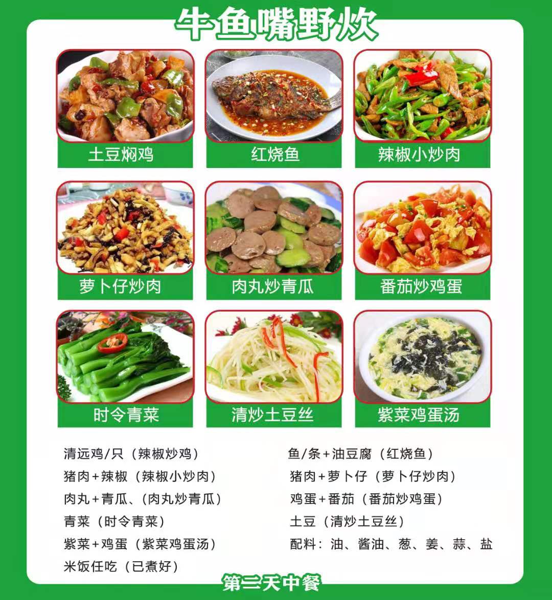 第一天午餐团队餐【菜单参考】老火靓汤,家乡葱油走地鸡,蒜苗乌宗鹅,水库大盘鱼,酸笋炒腩肉,美极金沙虾,农家酿三宝,香芹木耳炒猪肉,红焖浸潭豆腐,田园时菜 第二天午餐自助野炊(10-11/人/桌) |