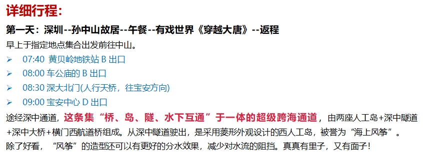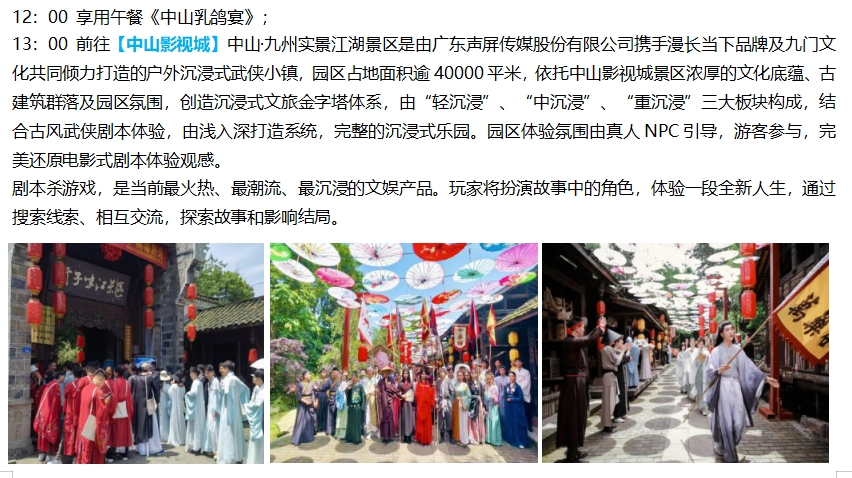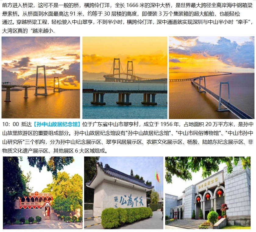 穿越:全球最高的跨海大桥一深中通道 体验:广东最大古风实景剧本游戏,玩转中山影视城有戏世界 游览:孙中山故居,重温革命血液的沸点 寻味:《中山乳鸽宴》 |