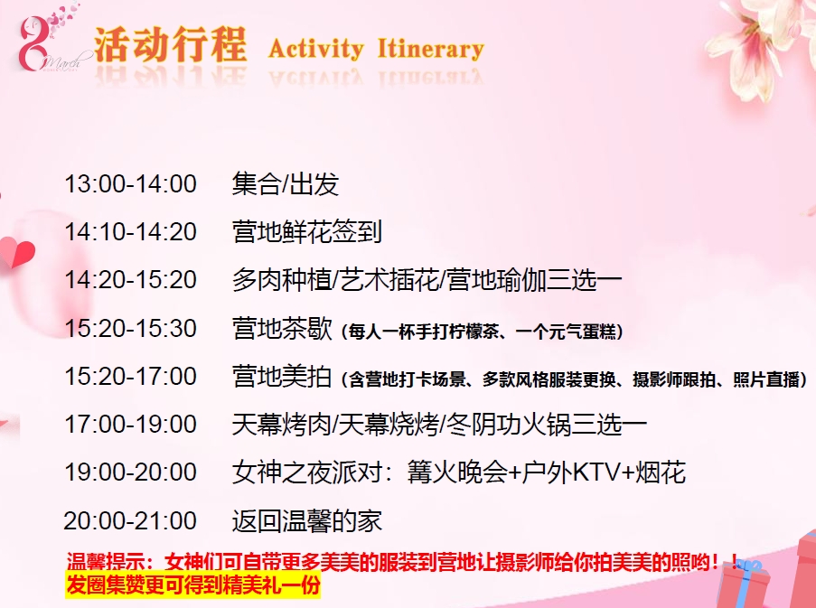 - 下一篇:三八节女神节团建活动-营地多肉DIY或插花或户外瑜伽-下午茶-烧烤BBQ烤肉-营地KTV一天 [2025-02-17]