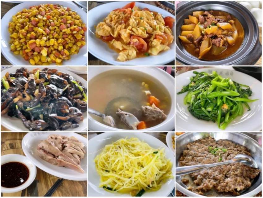 冬菇蒸鸡,菜干蒸肉饼,咖喱鱼丸,西红柿炒蛋,玉米粒炒火腿,土豆丝炒肉,蒸水蛋,时令青菜,紫菜蛋花汤,奶香馒头,餐后水果