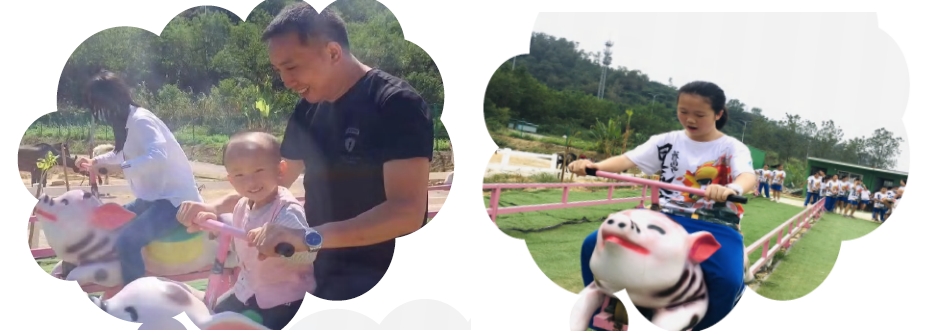 赛猪项目乘客可骑着小猪仔在一个直行轨道上行驶,随着轨道做前进、后退,由于手部做拉杆推动作用,轨道小猪在轨道上进行移动。