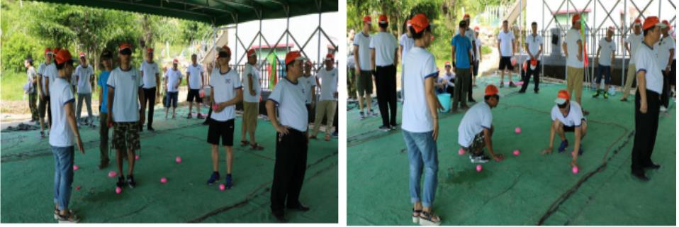 所有物资,但只能用肢体语言表达);副指挥官(副指挥官背对着活动区域,只能用语言来描述该项目任务);队员分别有不同的编号。每一组的队员都在这个活动区域内,但都是矇着眼罩看不到任何东西。只能用听力来判断完成任务。
