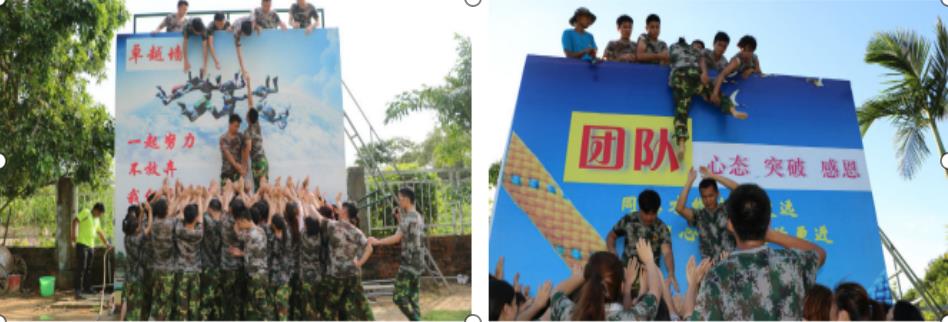 项目介绍: 全体队员在规定的时间内翻越一面4米高的光滑墙面,在此过程中,大家不能借助任何外界的工具,包括:衣服、皮带、绳子等,你们所能利用的资源只有你们的身体以及你们的聪明才智。